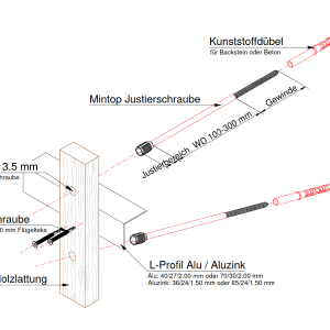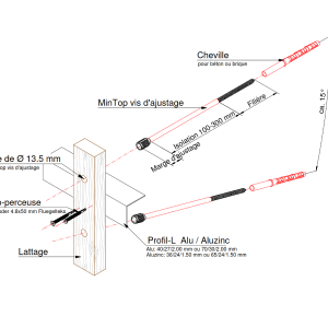 Le système type MinTop Vis d’ajustage est utilisé ponctuellement dans la sous-construction de façade. Il est composé de paires de vis disposées en V et de vis individuelles. La tête d’ajustage est conçue pour un engagement dans le bois. En fonction de l’utilisation, des profils métalliques horizontaux sont visés pour contreventement. Son domaine idéal d’engagement se situe dans la réfection de façades compactes et de bâtiments faisant appel à des isolants thermiques compacts.