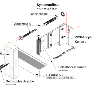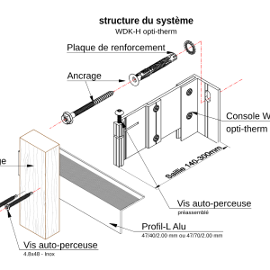 Le système WDK opti-therm horizontal est une sous-construction de façade qui réduit les ponts thermiques à un minimum. Une absence de ponts thermiques dépend de la distance du rideau et du nombre de pièces par m2. Il n’est pas possible de calculer de manière homogène lors des vérifications de la physique du bâtiment. WDK opti-therm horizontal a un large domaine d’application. Le plus souvent, le système est combiné avec un lattage en bois vertical. En raison de la hauteur du bâtiment, des profilés métalliques verticaux peuvent être utilisés à la place du lattage en bois. La sous-construction est un produit standard. Afin de proposer une solution économique, il est judicieux de demander conseil avant de déposer une demande de permis de construire. Pour les rénovations de bâtiments qui souhaitent réaliser des économies de chaleur acceptables avec une faible épaisseur de construction, c’est le domaine d’application approprié pour WDK opti-therm horizontal. Les distances de rideau à partir de 140 mm sont optimales pour ce système et peuvent ainsi fournir une efficacité d’isolation. Les joints de profilés horizontaux sont réalisés de manière standard avec des raccords de profilés, au point zéro du moment entre les consoles (distance entre les consoles mm *0.2).